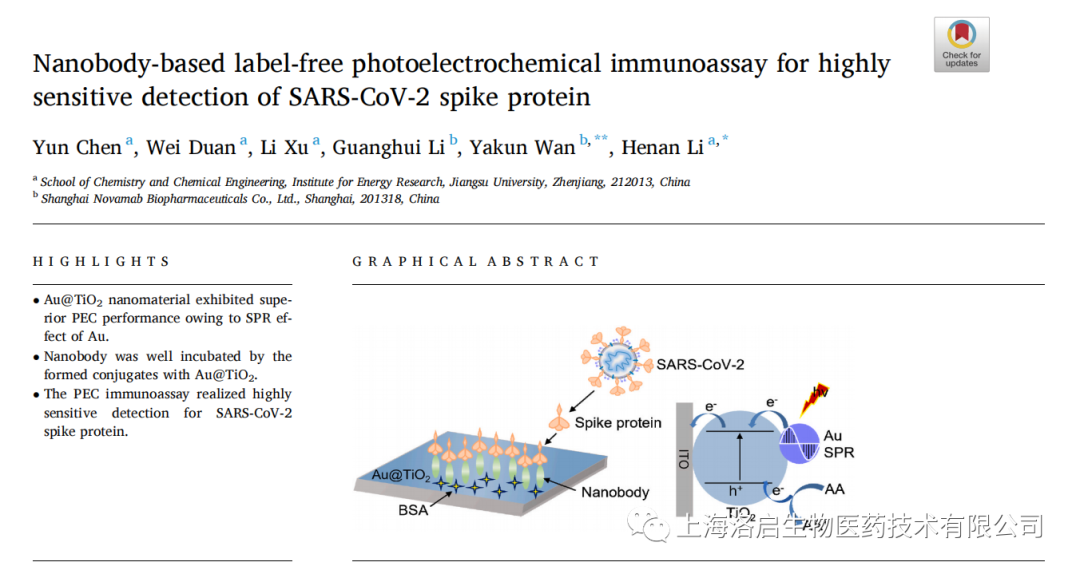 2022年5月3日,九州ku游官网生物和江苏大学化学化工学院李赫楠教授团队合作,在《Analytica Chimica Acta》发表了题为“Nanobody-based label-free photoelectrochemical immunoassay for highly sensitive detection of SARS-CoV-2 spike protein”的研究论文。九州ku游官网生物万亚坤博士和李贺楠教授为并列通讯作者,相关纳米抗体的知识产权归九州ku游官网生物所有。